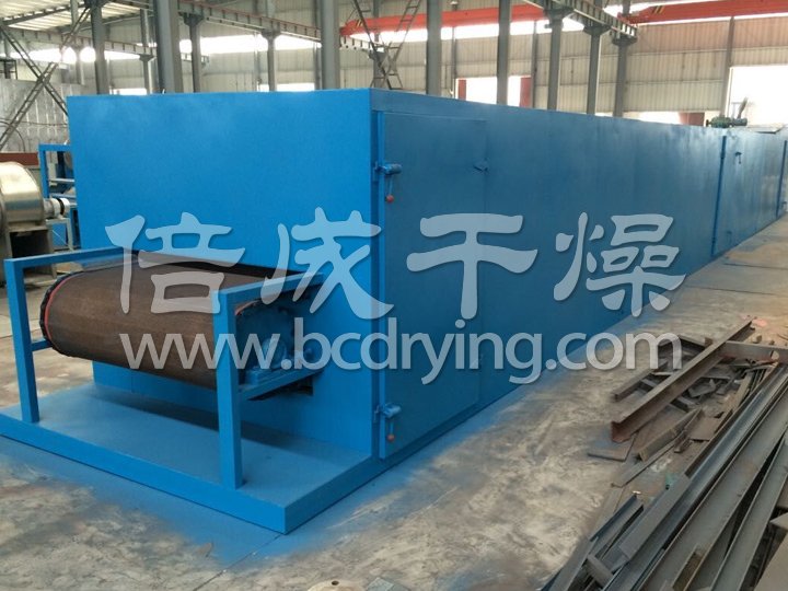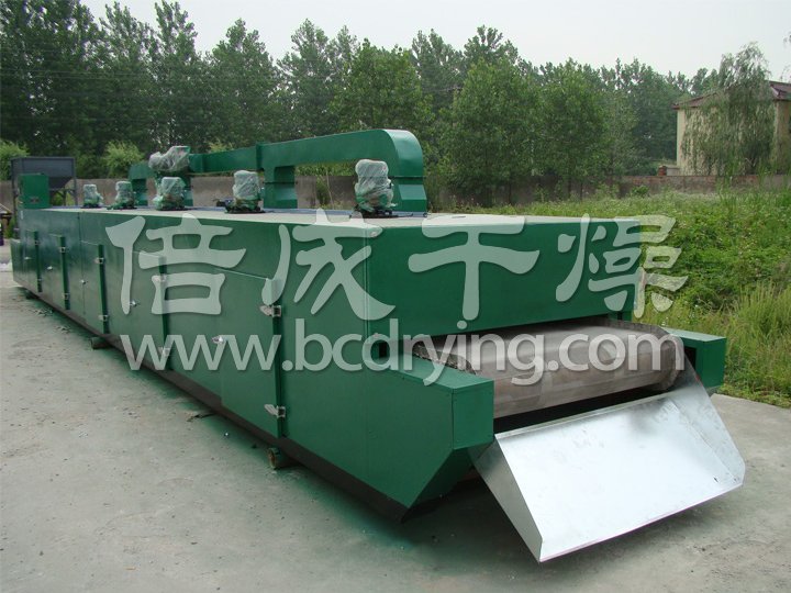 物料由加料器均勻地鋪在網(wǎng)帶上,網(wǎng)帶一般采用12-60目不銹鋼絲網(wǎng),由傳動裝置拖動在干燥機內(nèi)移動。干燥機由若干單元組成,每一單元熱風獨立循環(huán),部分尾氣由專門排濕風機排出,廢氣由調(diào)節(jié)閥控制,熱氣由下往上或由上往下穿過鋪滿物料的網(wǎng)帶完成熱量與質(zhì)量傳遞的進程,帶走物料水份。網(wǎng)帶緩慢移動,運行速度可根據(jù)物料溫度自由調(diào)節(jié),干燥后的成品連續(xù)落入收料器中。上下循環(huán)單元根據(jù)用戶需要可靈活配備,單元數(shù)量亦可根據(jù)需要選取。