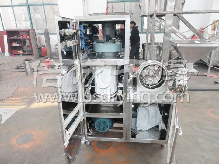 本機(jī)組利用活動(dòng)齒盤(pán)和固定齒盤(pán)間的相對(duì)運(yùn)動(dòng),使物料經(jīng)齒沖擊、摩擦及物料彼此間;沖擊而獲得粉碎。粉碎好的物料經(jīng)旋轉(zhuǎn)離心力的作用自動(dòng)進(jìn)入捕食袋,粉塵由吸塵箱經(jīng)布袋過(guò)濾回收。該機(jī)按“GMP”標(biāo)準(zhǔn)設(shè)計(jì),全部用不銹鋼材料制造,生產(chǎn)過(guò)程中無(wú)粉塵飛揚(yáng)。且能提高物料的利用率,降低企業(yè)成本,目前已達(dá)到較高水平。