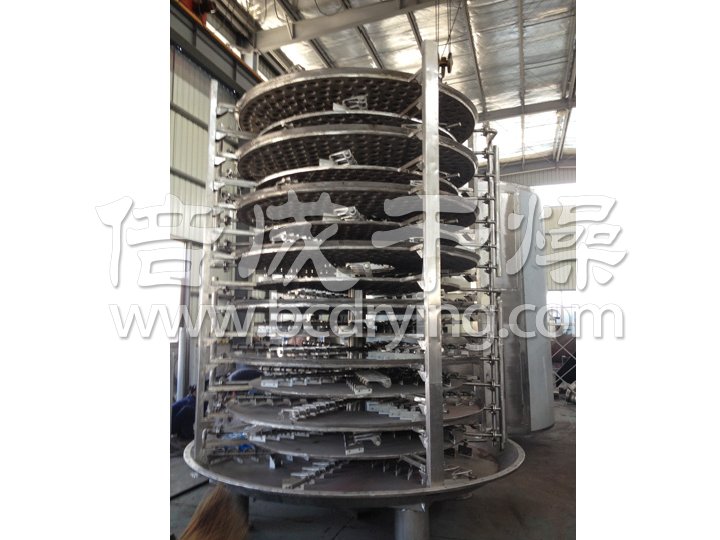 濕物料自加料器連續(xù)地加到干燥器上部第一層干燥盤上,帶有耙葉的耙臂作回轉(zhuǎn)運動使耙臂作回轉(zhuǎn)運動使耙葉連續(xù)地翻抄物料。物料沿指數(shù)螺旋線流過干燥盤表面,在小干燥盤上的物料被移送到外緣,并在外緣落到下方的大干燥盤外緣,在大干盤上物料向里移動并從中間落料口落如下一層小干燥盤中。大小干燥盤上下交替排列,物料得以連續(xù)地流過整個干燥器。中空的干燥盤內(nèi)通入加熱介質(zhì),加熱介質(zhì)形式有飽和蒸汽、熱水和導(dǎo)熱油,加熱介質(zhì)由干燥盤的一端進(jìn)入,從另一端導(dǎo)出。已干物料從后一層干燥盤落到殼體的底層,然后被耙葉移送到出料口排出。濕份從物料中逸出,由設(shè)在頂蓋上的排濕口排出,真空型盤式干燥器的濕氣由設(shè)在頂蓋上的真空泵口排出。從底層排出的干物料可直接包裝。通過配加翅片加熱器、溶劑回收冷凝器、袋式除塵器、干料返混機構(gòu)、引風(fēng)機等輔機,可提高其干燥的生產(chǎn)能力,干燥膏糊狀和熱敏性物 料,可方便地回收溶劑,并能進(jìn)行熱解和反應(yīng)操作。