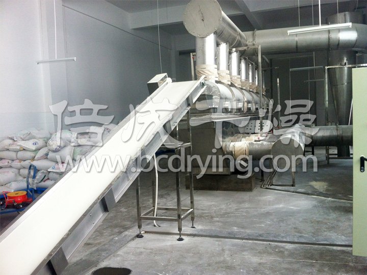 物料自進(jìn)料進(jìn)口進(jìn)入機(jī)內(nèi),在振動(dòng)力作用下,物料沿水平面流化床拋擲,向前連續(xù)運(yùn)動(dòng),熱風(fēng)向上穿過流化床同濕物料換熱后,濕空氣經(jīng)旋風(fēng)分離器除塵后由排風(fēng)1:3排出.干燥物料由排料進(jìn)口排出。